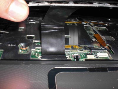 d) Desconecta previamente el cable flex del touchpad de la mobo, la parte superior aun esta ensamblada por unas pestañas hay que ir separándola de ambas partes suavemente.