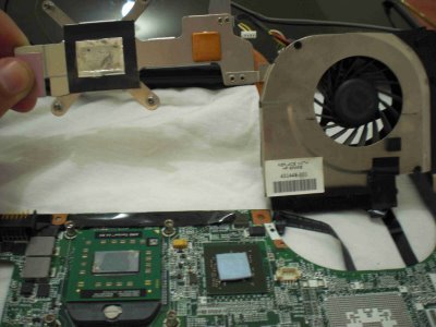 b) Si volteas la mobo veras la memoria el ventilador y el disipador. Para quitar el ventilador con disipador hay que desatornillar los 4 tornillos en el orden indicado en el metal del disipador. Luego hay que desconectar el ventilador de la mobo con cuidado.